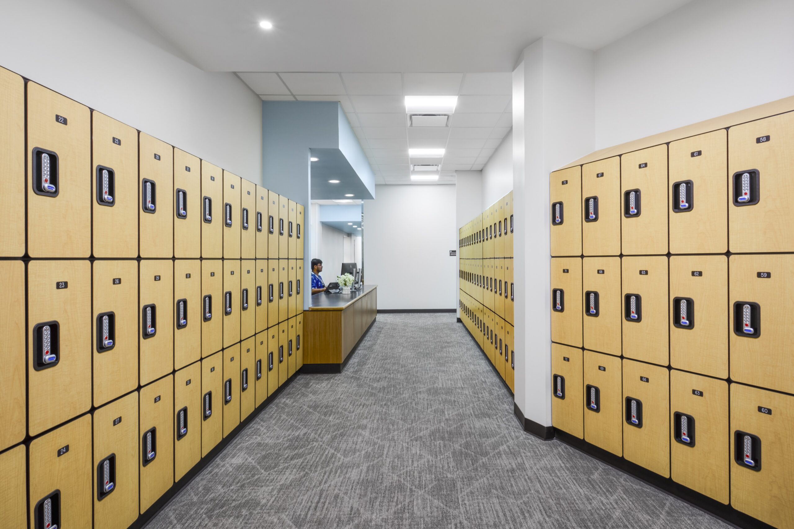 Wood grain patterning on the lockers, millwork, and strategically placed wall panels help to warm and soften the space while research into the impact of color on test performance drove the choice of three blue hues used as accents through the space. In the restrooms, introducing quartz counters and a touch-height band of smooth tile brings texture and tactile comfort into the design, providing touch points which feel especially soothing.
