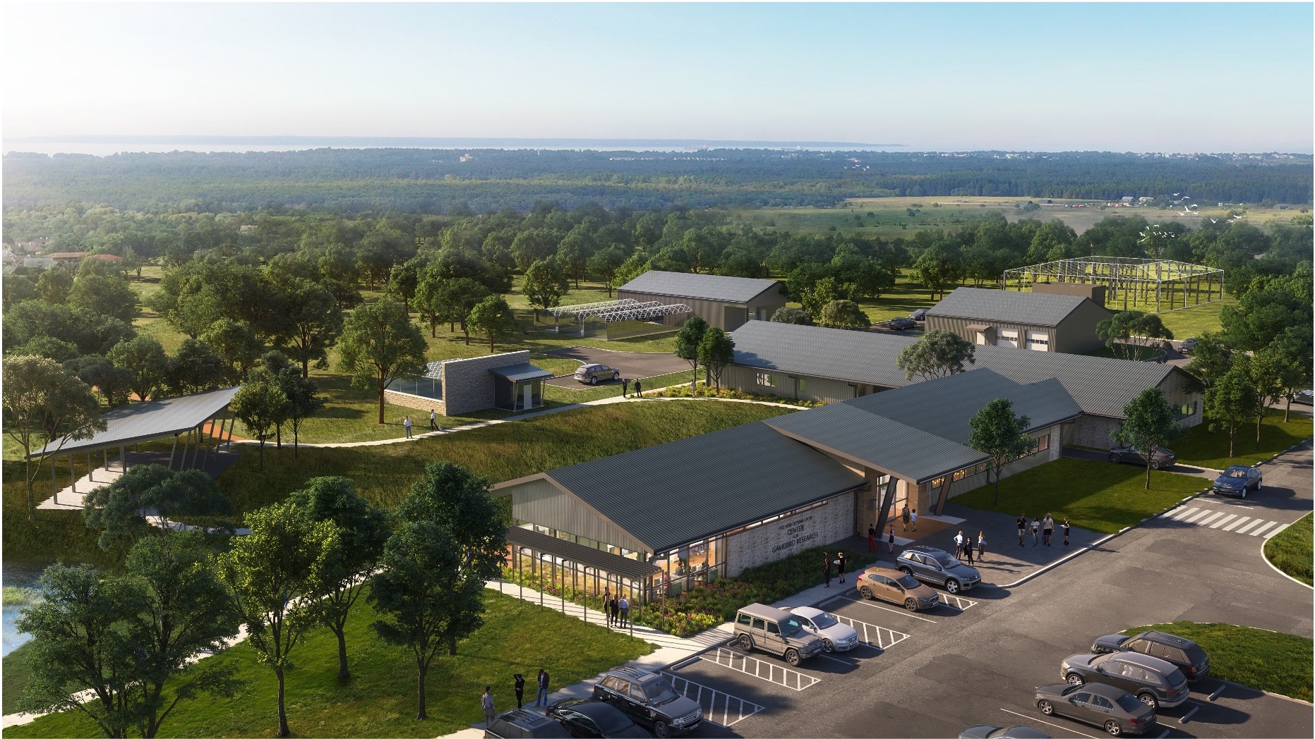 The project includes a Super Quail Facility which is comprised of bio-secure research labs containing breeding, raising, and training facilities and support structures. The project also includes administrative spaces, teaching spaces, indoor and outdoor event facilities, and a Quail Encounter which includes a pollinator meadow and bird viewing blinds located along nature trails winding through the artificial wetlands. The mission of the facility is to help restore natural quail populations by training captive-bred quail to exhibit the same survival instincts and responses as wild-raised quail to improve their transition back into nature, and to educate future researchers and the public.